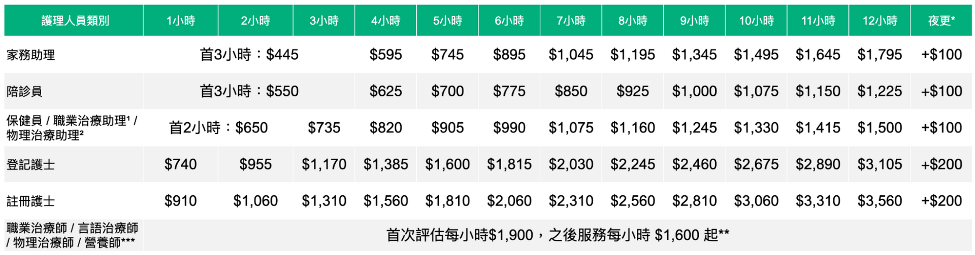 - 除非另有說明,所有透過 Evercare 聘用的護士和護理人員的服務均適用此服務計算方式。