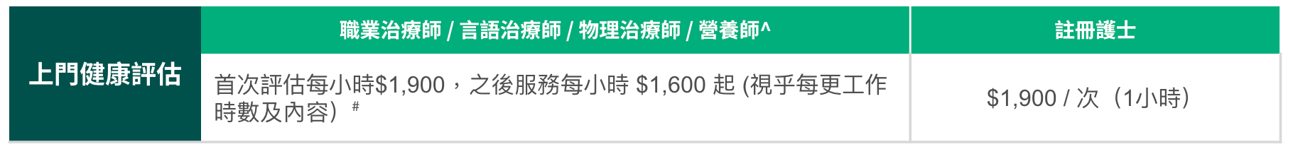 - 服務時數計算方法:不足一小時的服務將以每 30 分鐘為一個單位計費(例如,護理人員工作8小時5分鐘,將收取8.5小時的服務費。)。