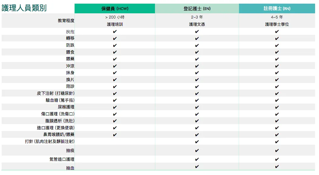 - 護理人員用膳時間:護理人員工作6小時能享有30分鐘有薪膳食時間;工作9小時或以上則有60分鐘。