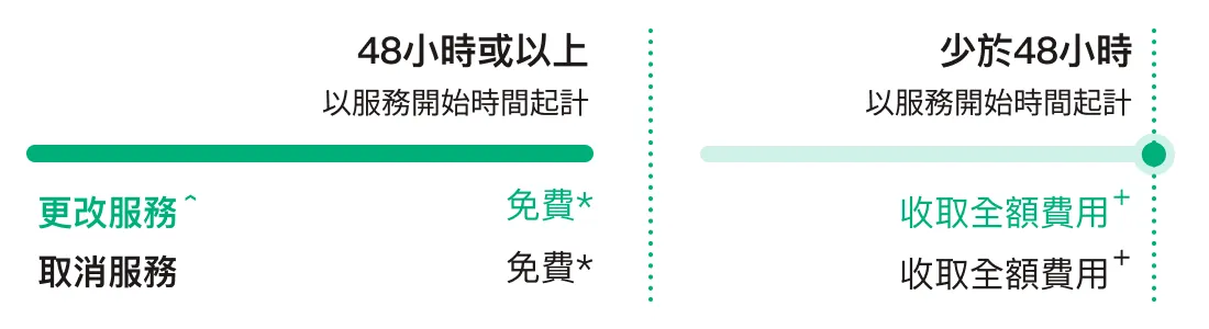 Evercare將盡力滿足客戶的更改請求,並根據以下通知期限收取相關費用。若無法滿足請求,該請求將被視為取消。